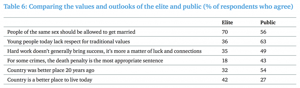 54 prosent av befolkningen synes da også at landet deres var et bedre sted å bo for 20 år siden, mens 42 prosent av eliten mener at landet de bor i er et bedre sted i dag. Bare 27 prosent av befolkningen mener det samme (side 23).
