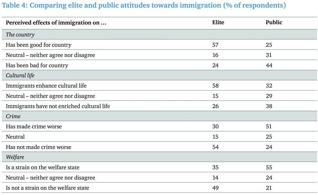 Mens 57 prosent av disse mener at innvandringen er og har vært bra for landet de bor i, mener små 25 prosent av befolkningen det samme. Majoriteten (51 prosent) mener at innvandringen har ført til verre kriminalitet og 55 prosent mener at den er en belastning på velferdssystemet (side 20).