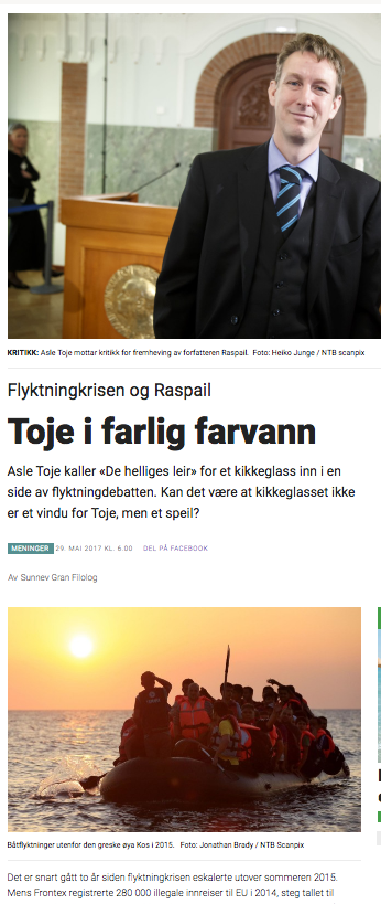 Asle Toje: «Mens alle syns enige om at Europa ikke kan være verdens livbåt, har Europas beslutningstakere så langt fulgt sine humanitære impulser, vel vitende om at det påfølgende innsiget vil overstige evnen til å ta dem imot.»