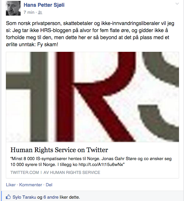Dette er for øvrig den debattansvarlige som er rask på ballen hvis han mener noe om HRS, og da skal vi virkelig skamme oss. Her fra 2015 da Hege Storhaug skrev en sak om at det blant syrerne kan være mange IS-sympatisører.
