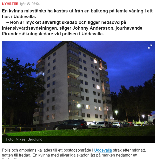 Forleden dag ble to kvinner kastet fra balkong i høyblokker. Den ene døde momentant i Södertälje, og en mann ble straks pågrepet mistenkt for drap. Dette skjedde ca 22.55 torsdag kveld. En halv time før, falt en annen kvinne i Uddevalla fra balkong i femte etasje. Hun ligger sterkt skadet på sykehus, og to menn, begge sterkt beruset, ble pågrepet mistenkt for mordforsøk.
