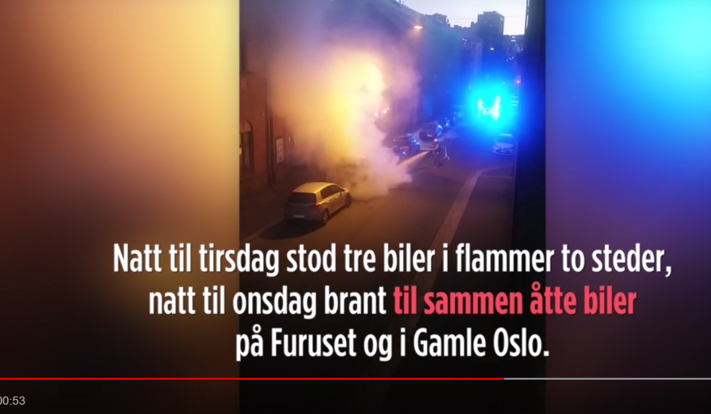 Herslebs gate i Oslo sentrum øst, natt til 21. juni 2017. Seks biler gikk opp i røyk. Dette er en skjermdump av en video en beboer sendte en sentral avis.
