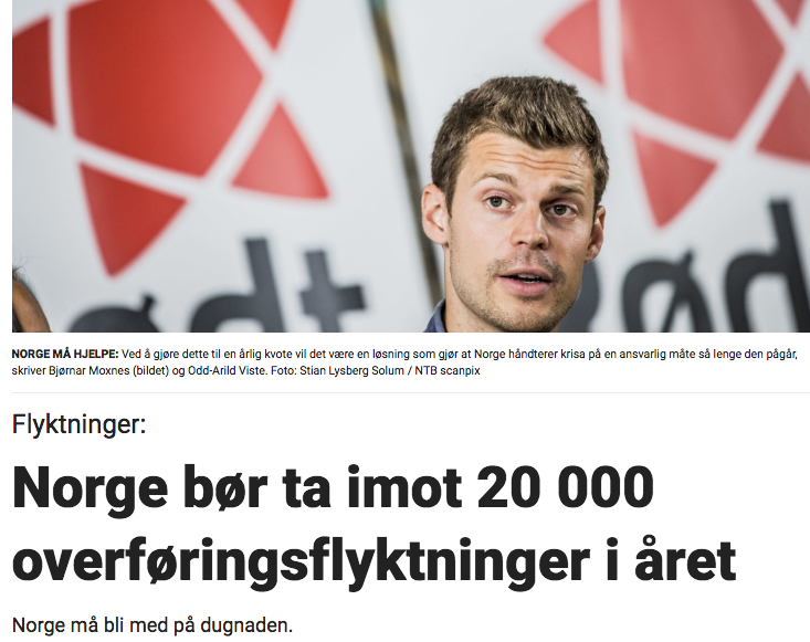 Dagbladet: «Norge bør ta imot 20 000 overføringsflyktninger i året. Norge må bli med på dugnaden», sier Bjørnar Moxnes og Odd-Arild Viste.