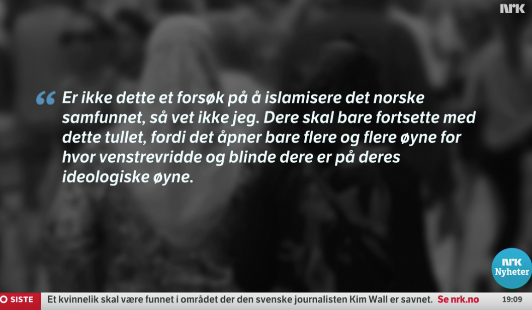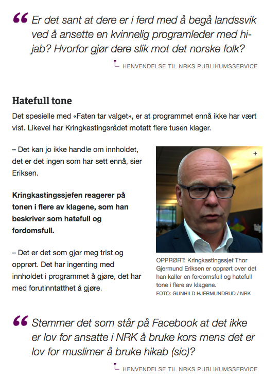 «Det er imidlertid ikke det at spørsmålet stilles som bekymrer, men intensiteten og raseriet problemstillingen reises på. Det har vært de rene kampanjer på sosiale medier og blogger hvor man har oppfordret folk til å klage. Kringkastingssjef Thor Gjermund Eriksen sier til Aftenposten at innholdet i mange av klagene er «hatefulle» og at de ikke er egnet til publisering. Mange ønsker rett og slett å retusjere bort jenter med hijab fra norsk offentlighet.»