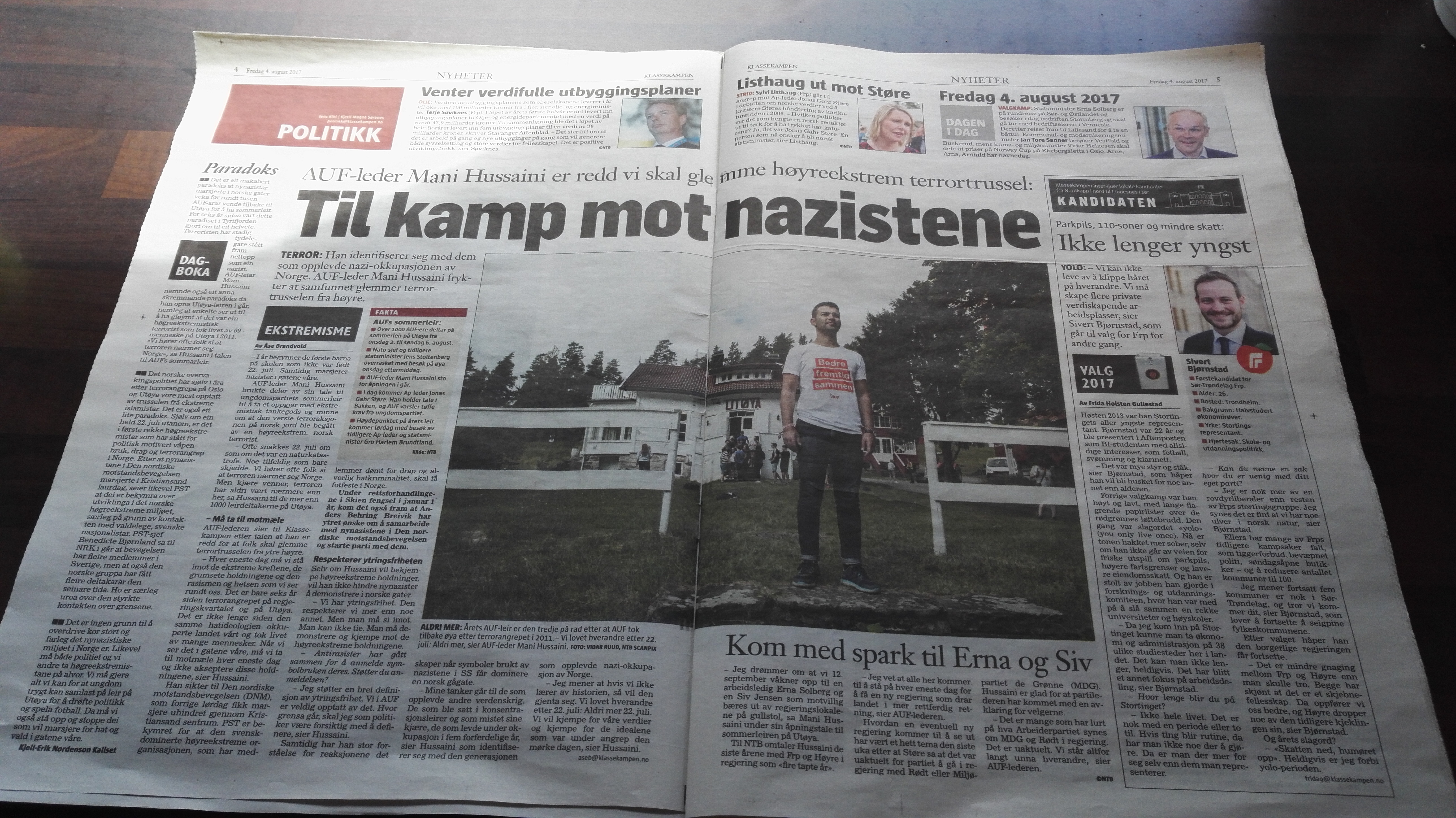I gårsdagens Klassekampen kunne vi lese at AUF-leder Mani Hussaini er opprørt og maner til kamp mot nazistene. Han identifiserer seg med dem som opplevde nazi-okkupasjonen av Norge. Intet mindre.