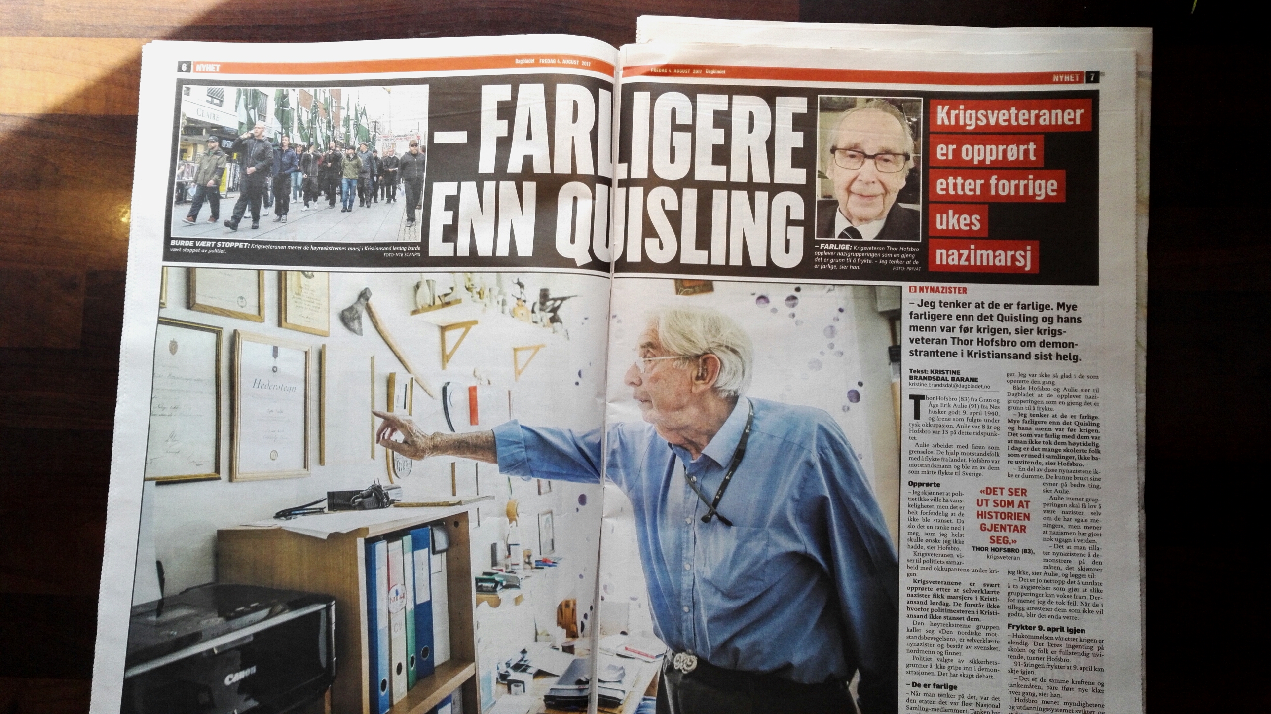 Krigsveteran Thor Hofsbro gir oss nesten åndenød. Hofsbro ”tenker at de er farlige. Mye farligere enn Quisling og hans menn var før krigen.»