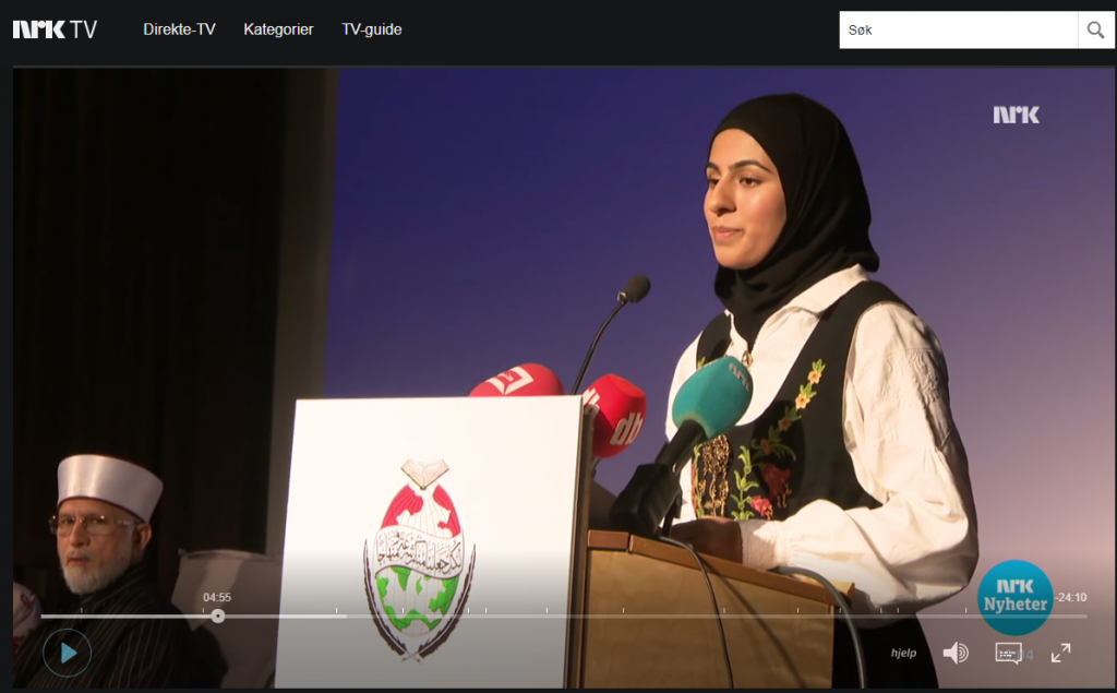 Muniba Ahmad i Sarpsborg som konferansier, og Qadri til venstre, ikke lenge før Sylvi Listhaug gikk på talestolen og ga dem en verdidose om steining og dødsstraffer. Skjermdump NRK.