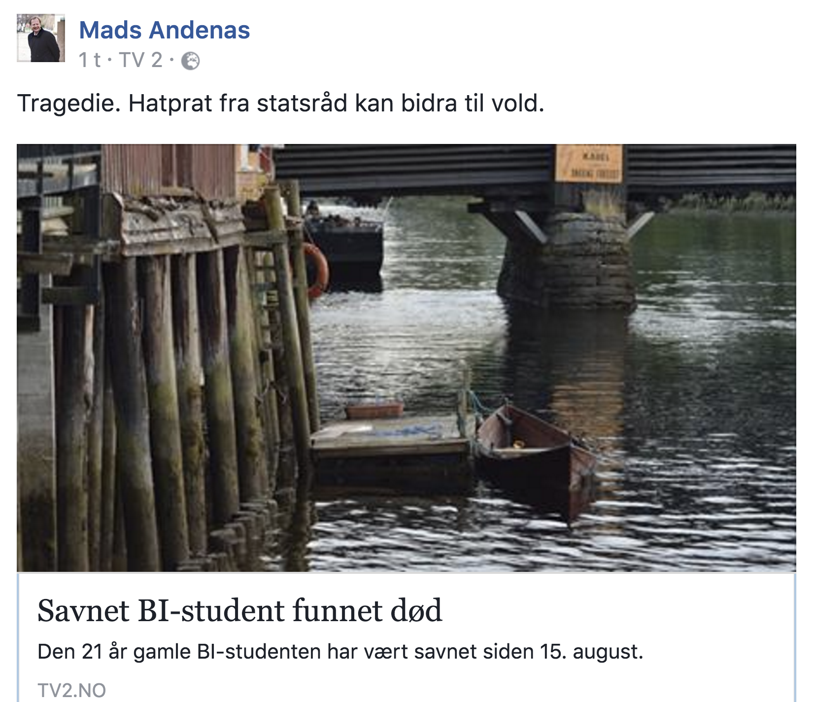 Men professor Mads Andenæs mener åpenbart at dødsfallet har sin forklaring i «hatprat fra en statsråd kan bidra til vold», og da vet vi han sikter til Sylvi Listhaug. Kan? Hvilken vold er det så Andenæs kjenner til? Hvem er det som oppviser «hatprat» her?