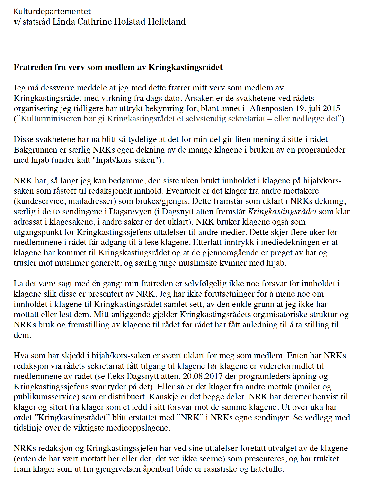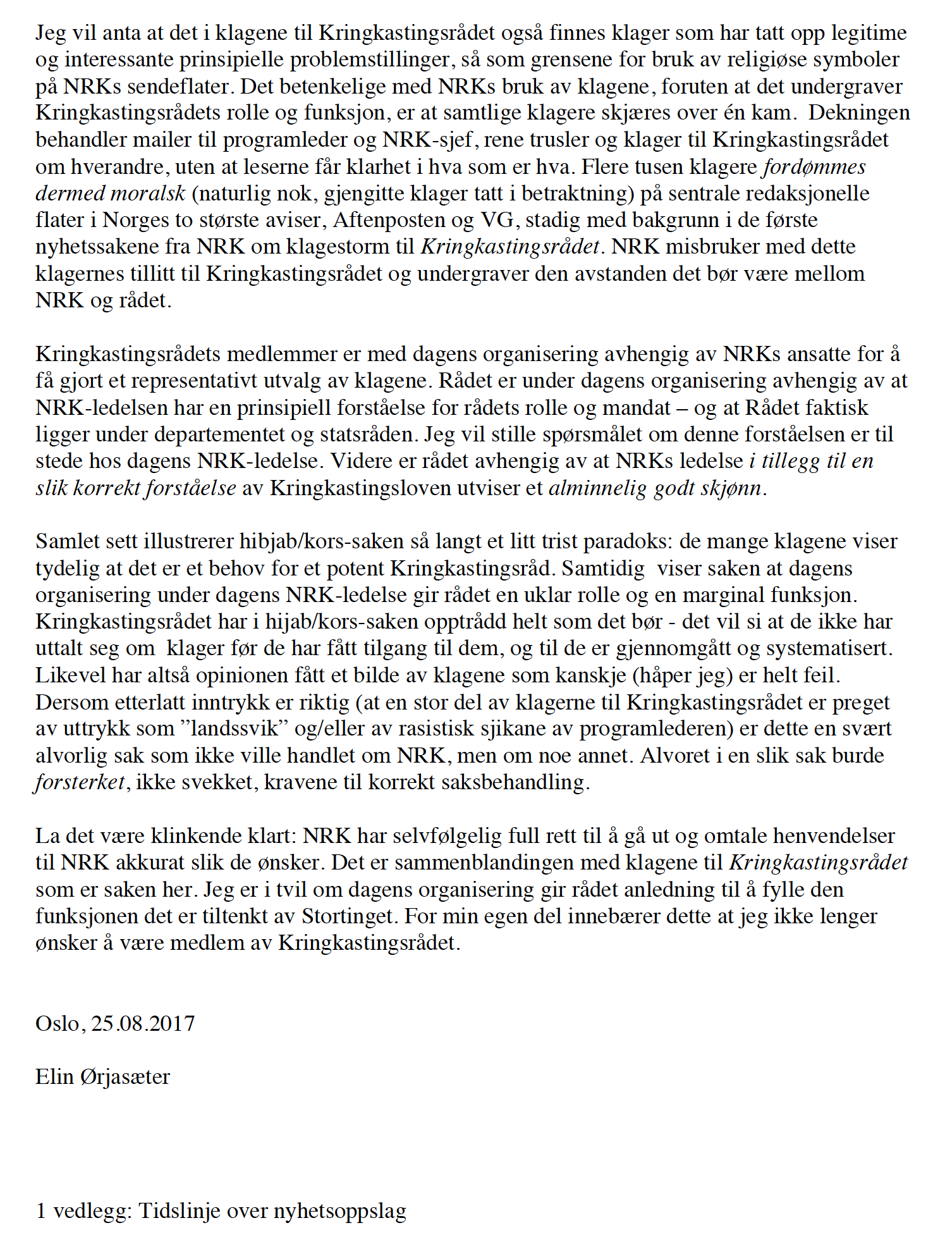 Så gjenstår det å minne om at kringkastingssjefen ikke er noen tilhenger av Kringkastingsrådet. I fratredelsesbrevet viser Ørjasæter til tidligere uttalelser hun kom med i Aftenposten 19. juli 2015. Her fremkommer det at Eriksen har gått inn for nedleggelse av Rådet.
