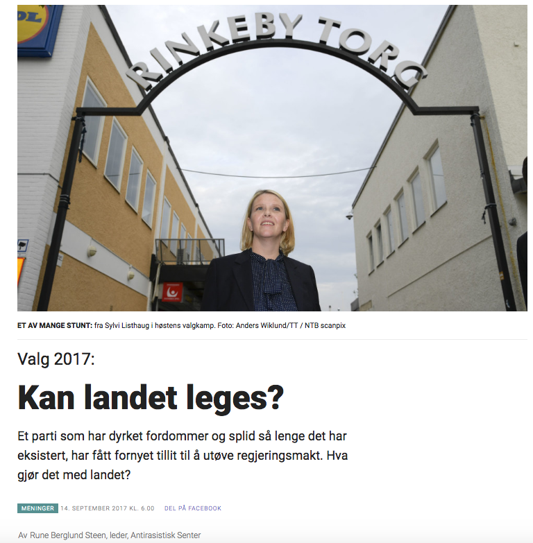 «Dette er altså landet som ikke klarte å stanse høyrepopulisters framgang, til forskjell fra Frankrike og Nederland. Dette er Norge, i alle fall for nå. Jeg holdt på å skrive ‘Velkommen til oss’, men det ville ha vært upresist.»