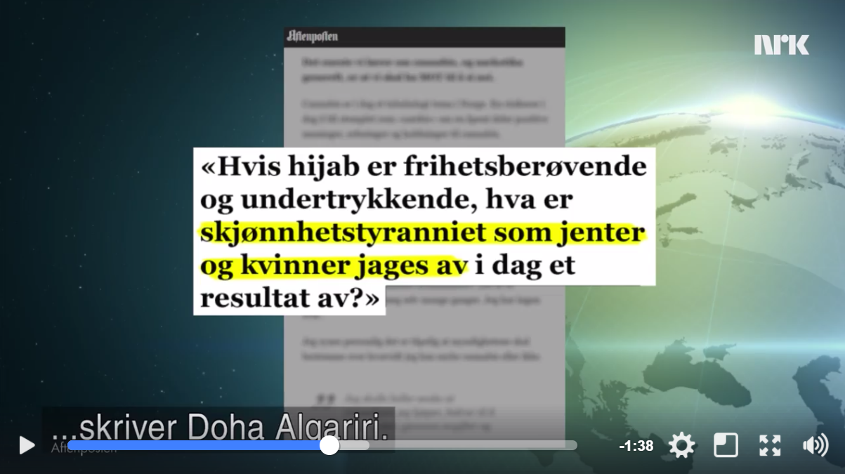 Slik kunne jeg fortsatt. Hvorfor NRK holder på slik, tror jeg har dette enkle svaret: NRK ble utfordret av folket gjennom alle hijab-klagene. Nå svares det tilbake. NRK skal ha oss til å tie og finne oss i at hijaben «er kommet for å bli» – og for å bli langt flere.