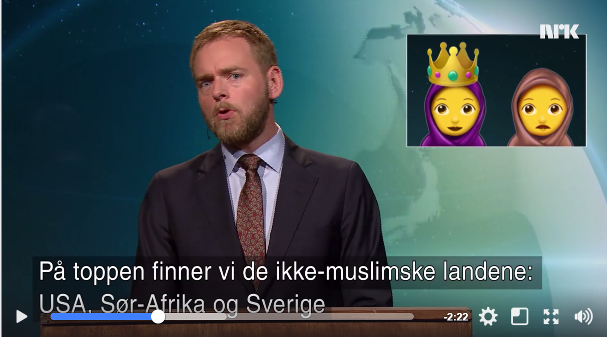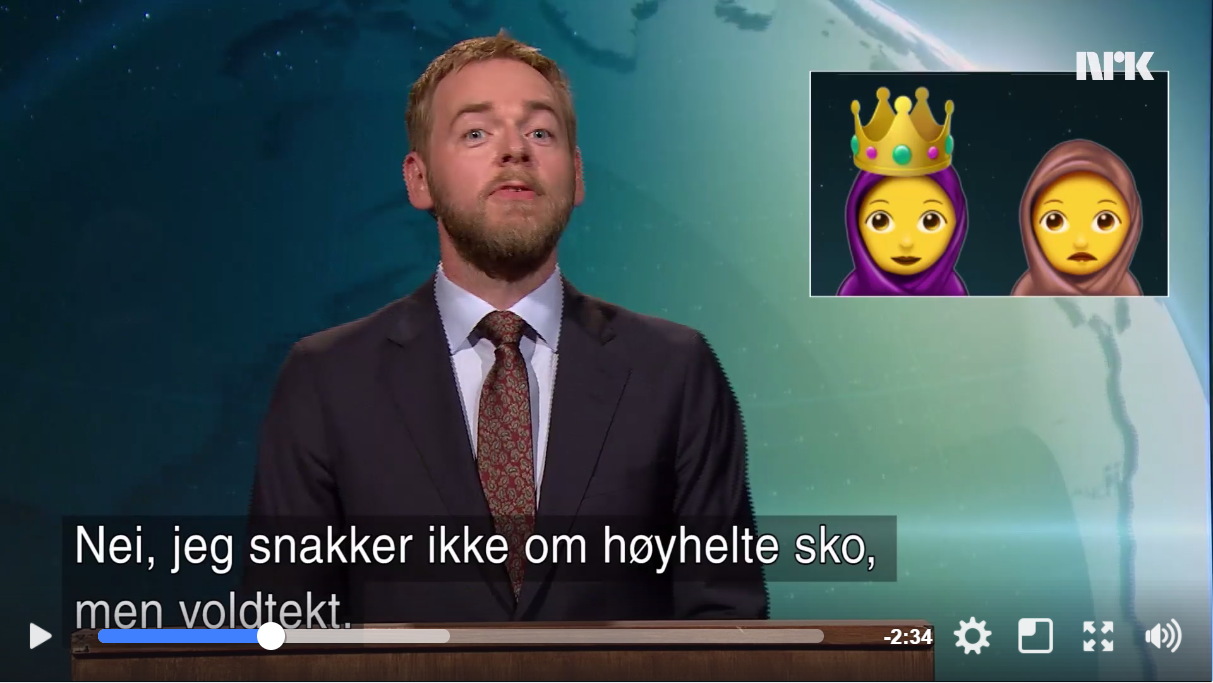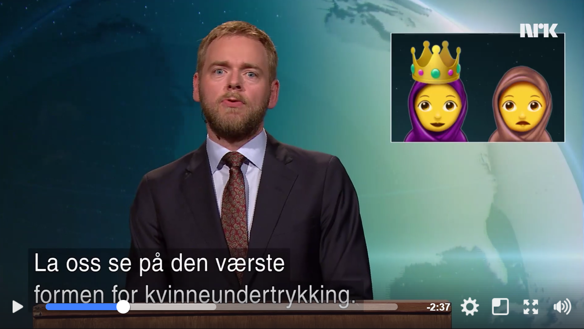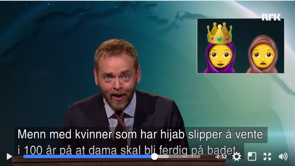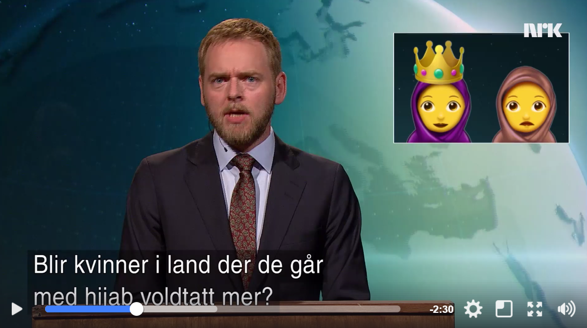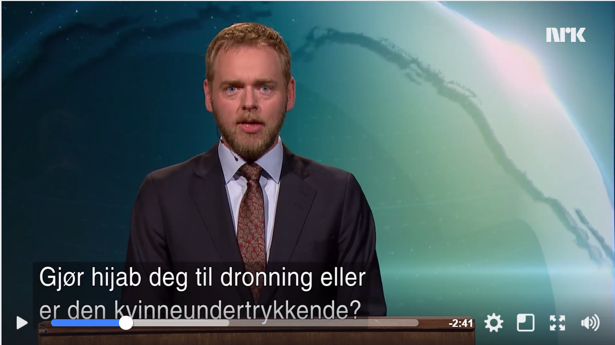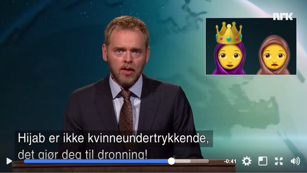Tore Sagen og hans mannskap har i programmet Satirisk tatt for seg hijab. NRK har nemlig mottatt over 6 000 klager etter å ha brukt den hijabkledde Faten Mahdi al-Hussaini som programleder før stortingsvalget. Folk har selvsagt klaget fordi de med belegg mener spredning av hijab er med på å frata jenter og kvinner frihet i det offentlige rommet. Innslaget på Satiriks kan presenteres slik: