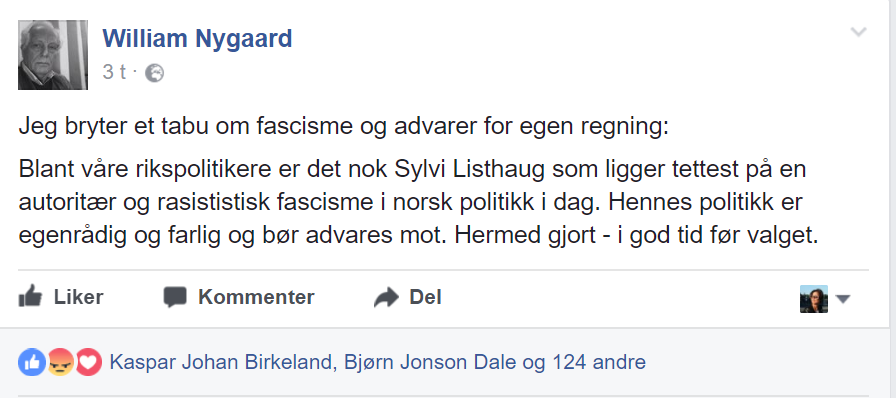 William Nygaard fortsetter slik: «Hennes politikk er egenrådig og farlig og bør advares mot. Hermed gjort – i god til før valget.»