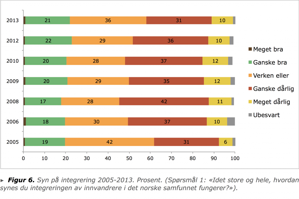 - 45 prosent er negative til å slippe flere innvandrere inn i Norge og mener at integreringen går dårlig. Det var en økning på 9 prosentpoeng fra 2005, men en nedgang fra 2010 hvor 53,7 prosent av de spurte mente at Norge ikke burde ta imot flere innvandrere.