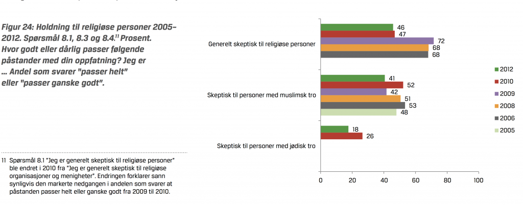 Og i motsetning til hva den stadig mer hysteriske sekten Antilisthaugianerne forsøker å innbille oss, så har disse holdningene vært stabile hele veien: Rundt halvparten av befolkningen er, og har vært, negative til ytterligere innvandring. Når det kommer til islam, er holdningene gjennomgående negative: en majoritet er og har hele tiden vært, dypt skeptiske til islam og dens uttrykk. Som vi vil se, kom ikke disse holdningene over natten 11-12 september 2013, og slett ikke på timen da Sylvi Listhaug tiltrådte som innvandrings- og integreringsminister den 16. desember 2015.
