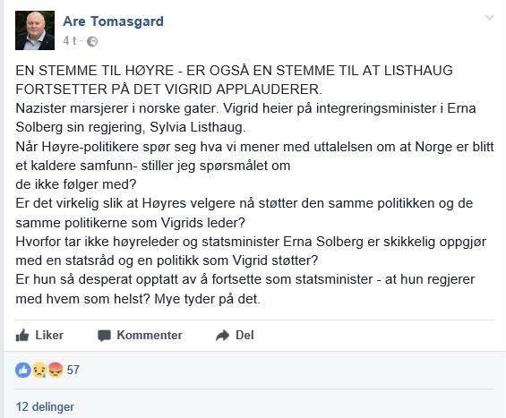 EN STEMME TIL HØYRE – ER OGSÅ EN STEMME TIL AT LISTHAUG FORTSETTER PÅ DET VIGRID APPLAUDERER, vræler han i vaskeekte Capslock, og fortsetter: «Er det virkelig slik at Høyres velgere nå støtter den samme politikken og de samme politikerne som Vigrids leder?»