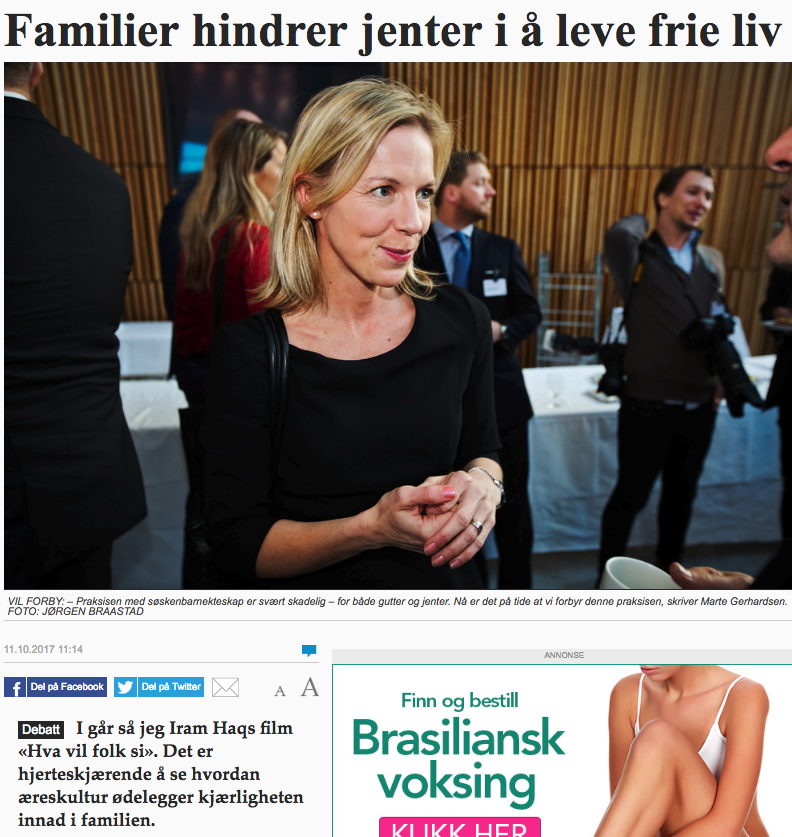«Men i ettertid er det lett å se at jeg og andre i iveren etter å bygge bro og skape toleranse, overså hvordan kulturelle og religiøse normer innad i minoritetsmiljøene skader og begrenser menneskers mulighet til å leve gode liv.» (…) «Med gode hensikter har vi dermed, uten å mene det, underkommunisert alvorlige problemer som mange jenter og kvinner møter i vårt samfunn. Men det er det slutt på nå.»