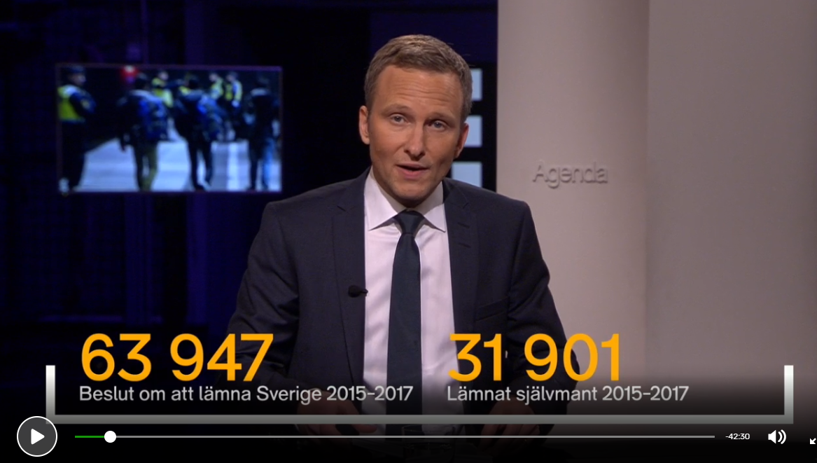 Grensepolitisjefen Patrick Engström beskriver et systemsammenbrudd. Det er verken ressurser eller effektiv lovgivning til å kunne håndtere de mange tusen som skal transporteres ut av Sverige etter asylavslag. Siden migrasjonskrisen seilte opp for fullt i 2015, har 63 947 asylanter fått avslag. 31 901 asylsøkere med avslag har forlatt Sverige frivillig i noenlunde samme periode.