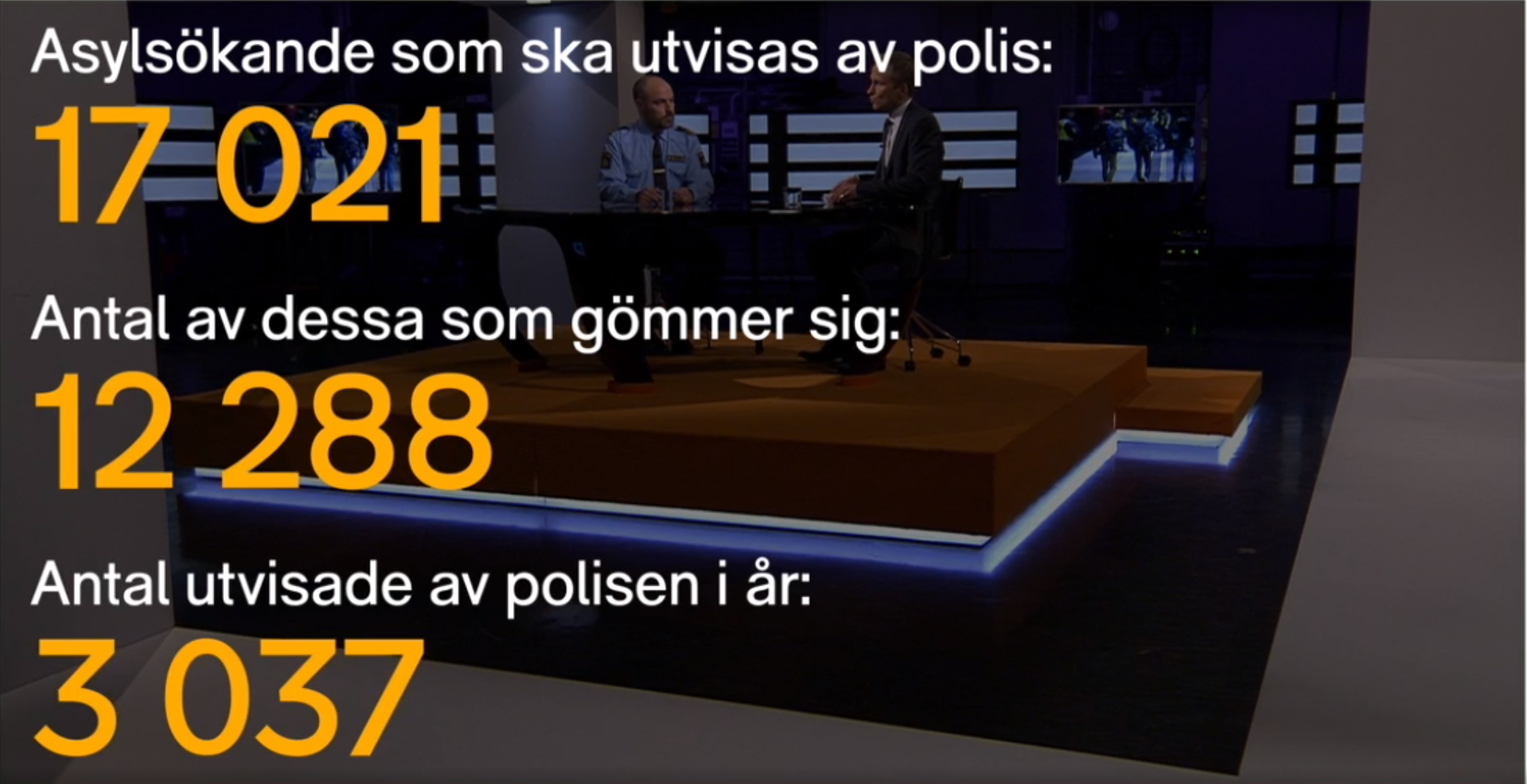17 000 skal nå utvises av politiet. 12 000 av dem er gått under jorden eller har forlatt Sverige til et annet europeisk land. Oppgaven med å finne dem, er så godt som uoverkommelig. Mange har oppgitt feil identitet da de søkte, atter andre vil hjemlandene ikke ta imot. Situasjonen er mildt sagt uhyre ressurskrevende, ifølge grensepolitisjefen. De klarer i dag knapt mer enn 3 000, maksimum 4 000 i året.