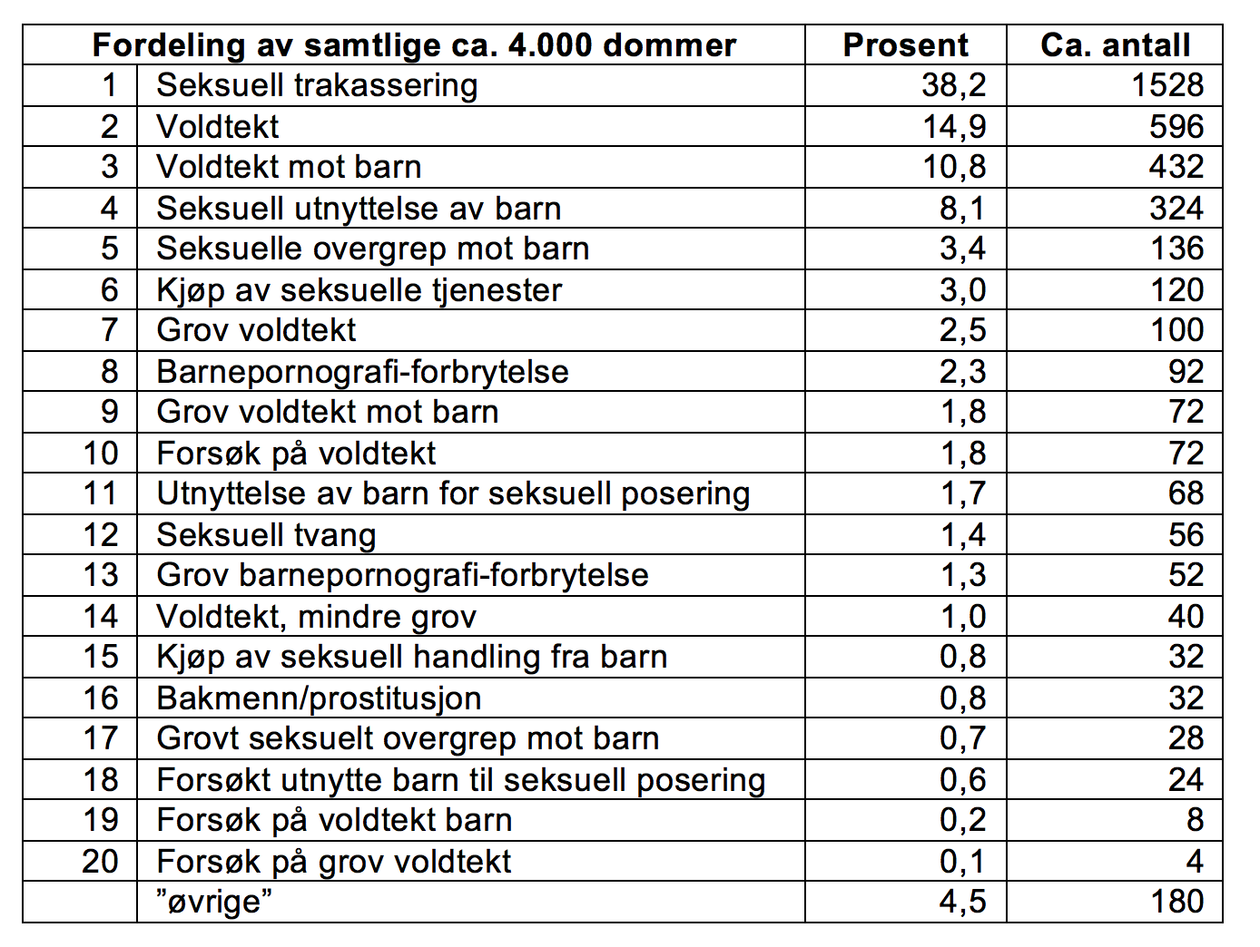 Gitt hovedfunnene over er det viktig å sette disse i kontekst. Men da begynner også utfordringene. For hvordan kategoriserer Jansson de ulike seksualforbrytelsene? Han har selv gitt en fordeling av samtlige dommer (side 11), der han fordeler prosentandelen på gitte kategorier. Da vi ikke kjenner det helt konkrete antallet dommer har jeg tatt utgangspunkt i 4.000 og gitt et anslag på antall dommer på hver kategori. Jamfør tabell under.