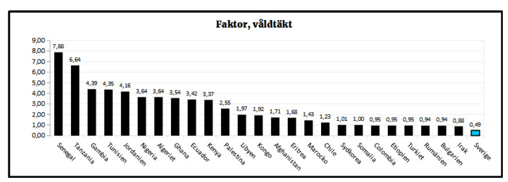 Bruker vi igjen dommene knyttet til voldtekt (de 614 dommene) er dømte etter region nesten halvparten fra Europa (48,7 prosent), mens 22,4 prosent er fra Midtøsten og Nord-Afrika (Mena-land), fra Afrika er andelen 16,7 prosent, Asia teller 7,1 prosent og Syd-Amerika 4,7 prosent. Men gitt befolkningsgruppenes ulike størrelse i Sverige har Jansson vektet dem (faktor). Gjerningspersonenes opphav er veid etter følgende nøkkel: Hvis f.eks. marokkanere utgjør tre av 105 voldtektsmenn i gruppevoldtekter tilsier det 2,86 prosent av dommene, samtidig som marokkanere i Sverige utgjør 0,57 prosent av samtlige innvandrermenn. Det gir en faktor på 5,0 (2,86/0,57). For voldtekter gir det følgende, der faktorberegningen kun er gjort ut fra landgrupper som har flere dømte gjerningsmenn (faksimile fra rapporten, side 20).