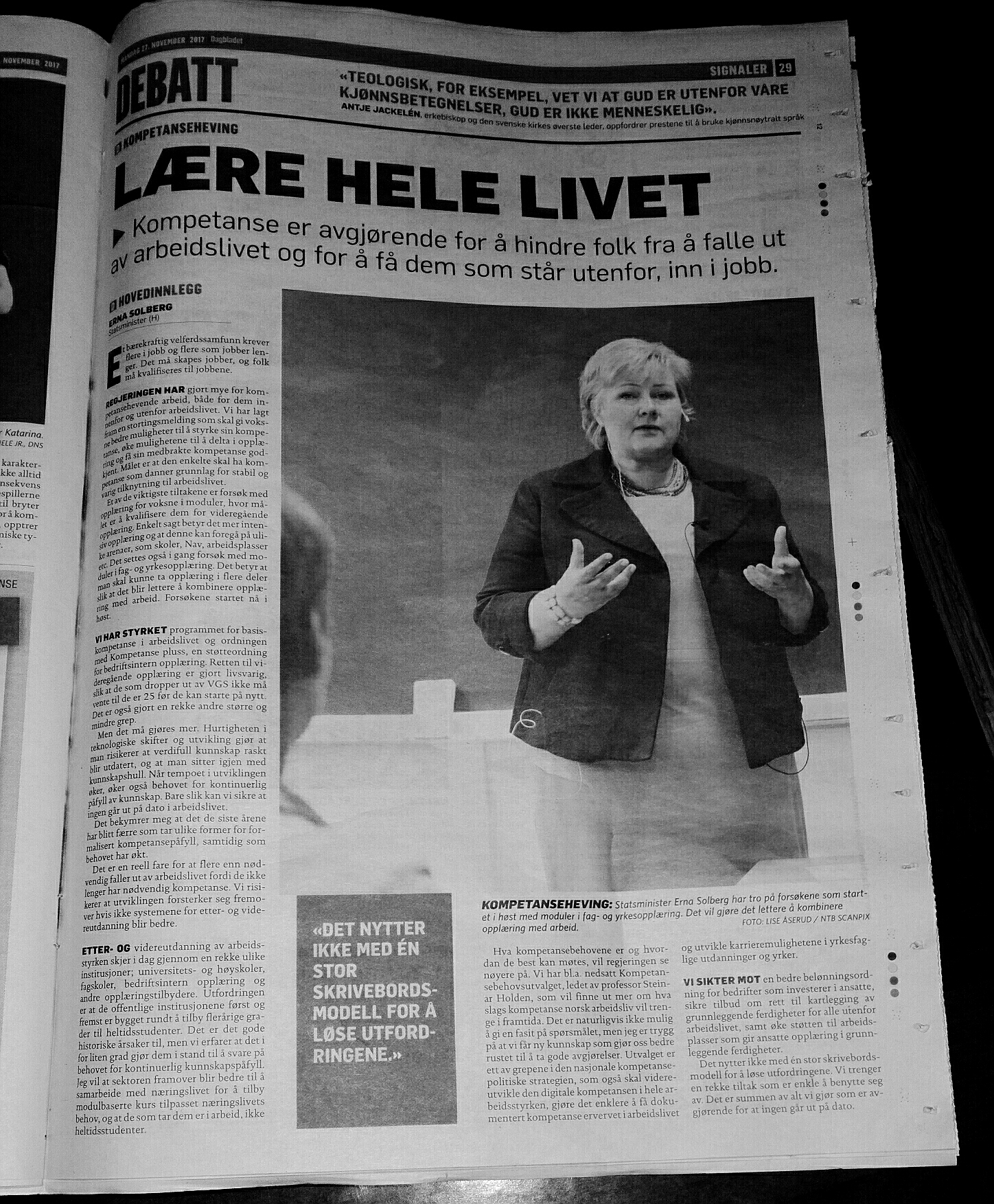 Erna Solberg: «Et bærekraftig velferdssamfunn krever flere i jobb og flere som jobber lenger. Det må skapes jobber, og folk må kvalifiseres til jobbene.» (Dagbladet)