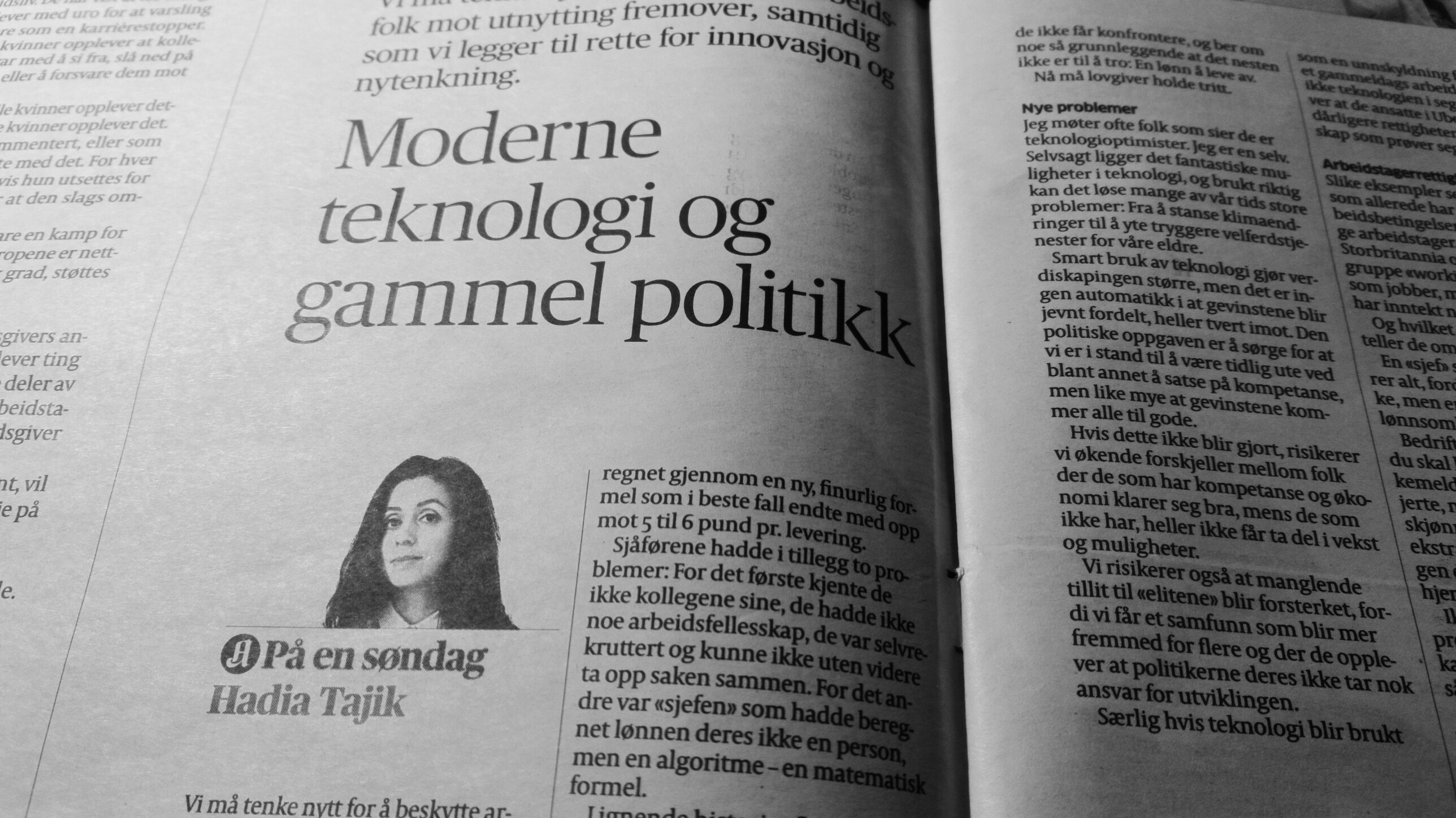 I Aftenpostens søndagsutgave uttrykker Hadia Tajik (Ap) bekymring for arbeidsfolk. Under tittelen «Moderne teknologi og gammel politikk» er hun bekymret for hvilke konsekvenser moderne teknologi kan få for arbeidsfolk.