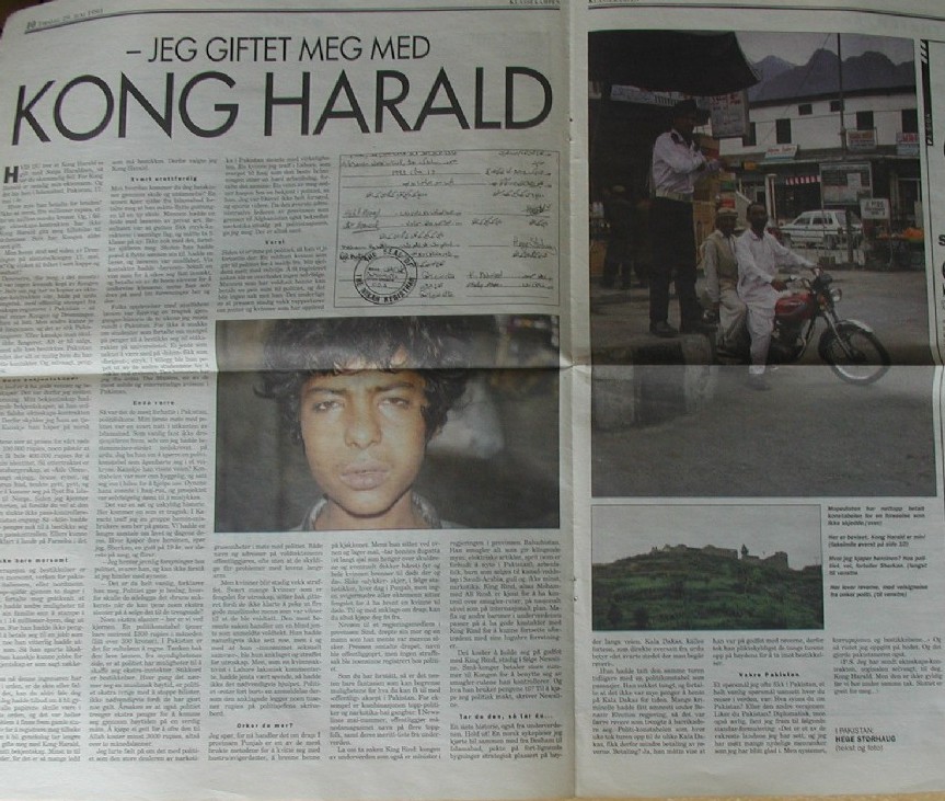 Jeg har dokument fra Pakistan som viser at jeg er gift med Kong Harald. (Han skylder meg fremdeles 1 million kroner i medgift etter vielsen i Islamabad 17. mai 1993. Kontonummeret mitt er …) Ekteskapskontrakten ble kjøpt i «basaren» for en slikk og ingenting.