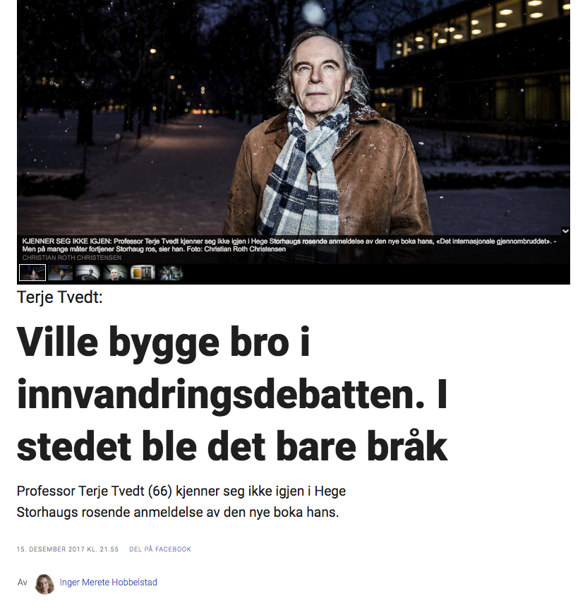 Det er ikke lenge siden han ga ut boka «Det internasjonale gjennombruddet». Han er blitt hyllet av Hege Storhaug på Human Rights Service som en som kler av «eliten», rost av kunnskapsminister Torbjørn Røe Isaksen, slaktet av Aage Borchgrevink i Dagbladet som en «mistenksomhetens historiker», og ellers høstet alle mulige sterke meninger, oftere enn ikke fra folk som ikke hadde rukket å lese boka. Og fremdeles hevder Tvedt at han er en brubygger.