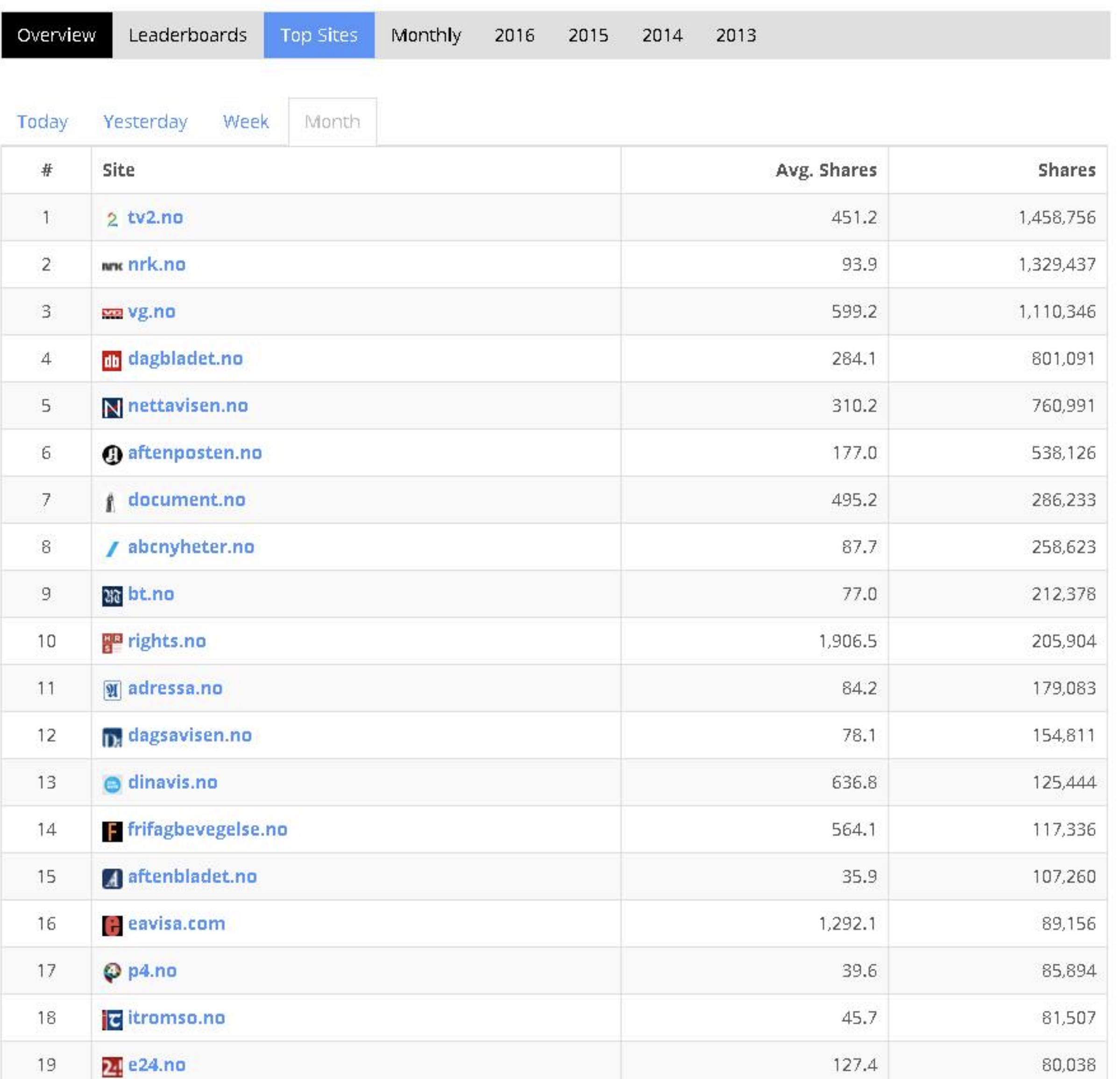 Norges største nettsteder målt i antall reaksjoner siste 30 dager, plasserer HRS’ nettsted Rights.no på en 10.plass med i overkant av 200.000 delinger.