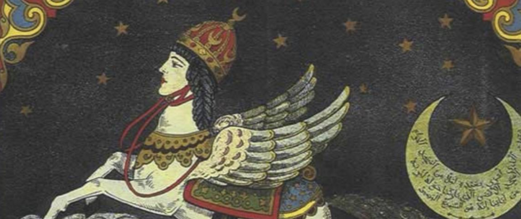 Det handler om den såkalte nattlige reisen til Muhammed, miraj. Før han forlot ørkenen på den arabiske halvøya og videre steg til himmels for samtaler med Allah, mellomlandet han i Jerusalem, sier tekstene. Og ferden gikk på et «langt og hvitt dyr, større enn et esel, men mindre enn et muldyr, og avstanden mellom, hvor hovene rørte jorden, var så langt øyet bar». I islamsk tradisjon fremstilles dette dyret (borak) oftest som en hvit hoppe med kvinneansikt, påfuglhale og vinger.