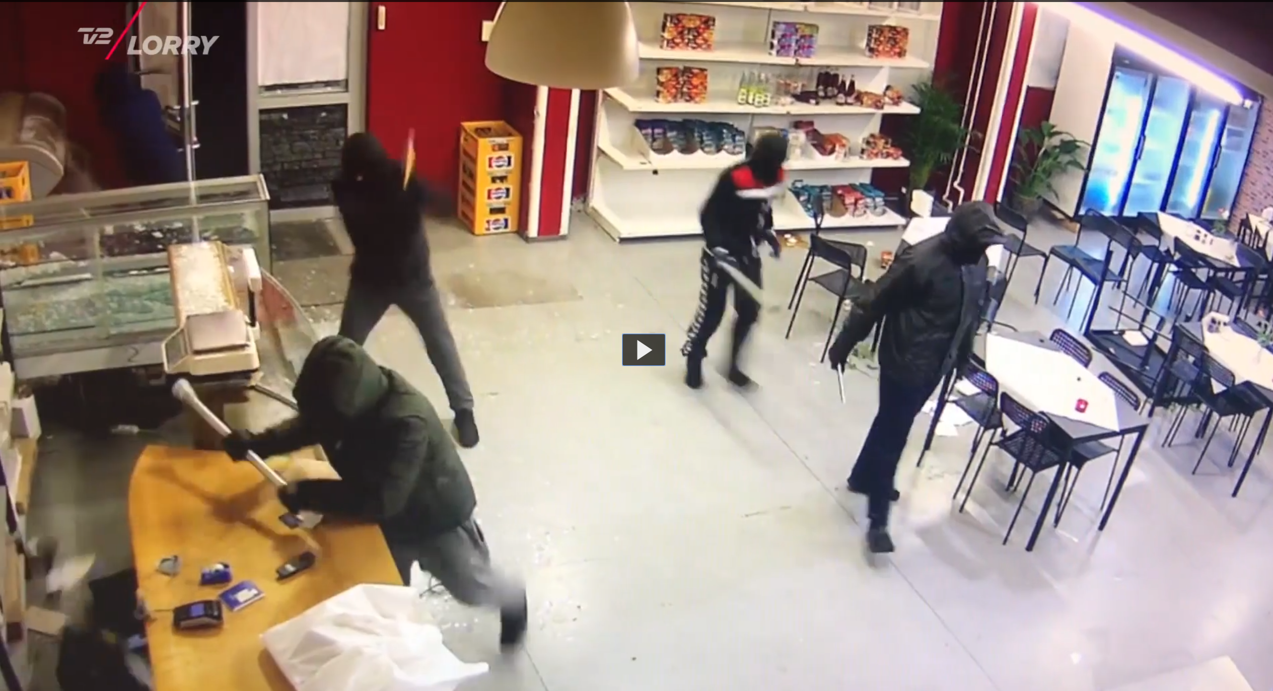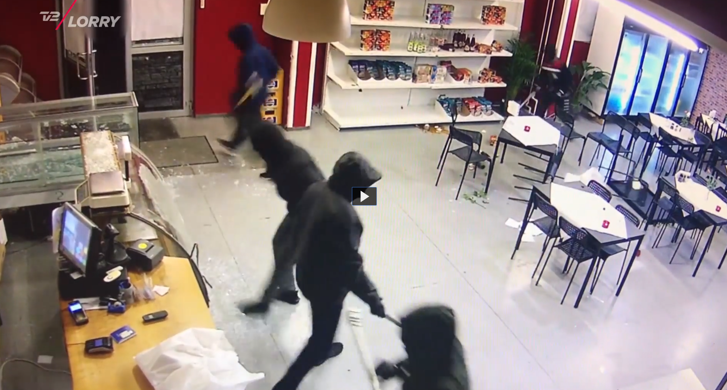 Mareridtet startede allerede i torsdags. På overvågningsbilleder, som TV 2 Lorry har fået lov til at bringe, ser man, hvordan et kanonslag smadrer butikkens vinduer, mens der også blev kastet sten mod butiksfacaden.