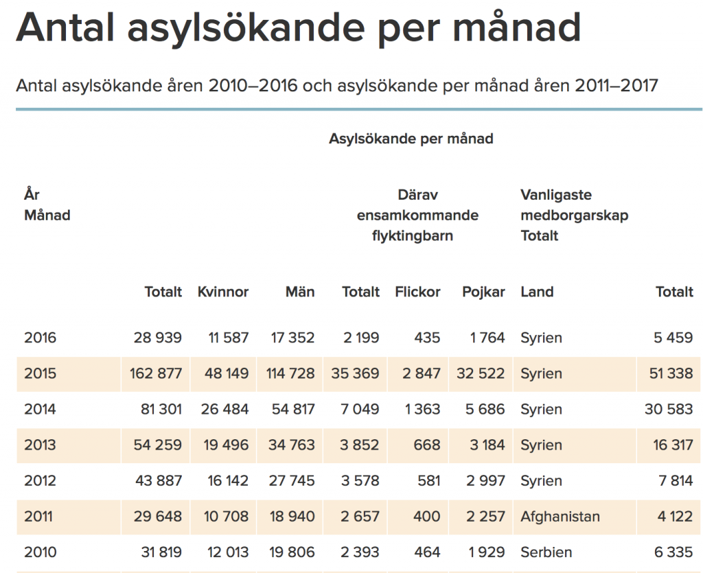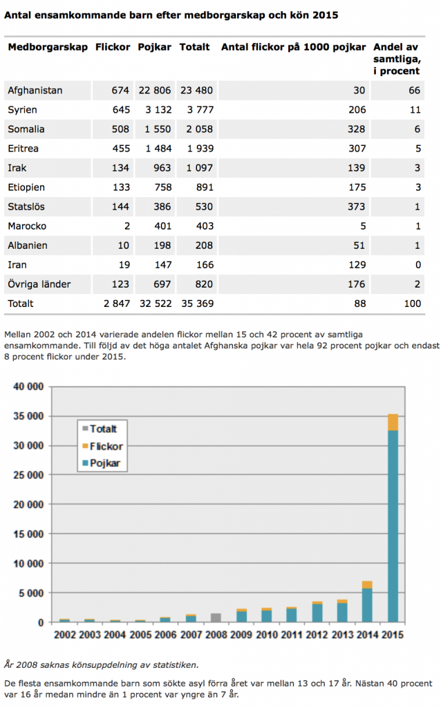Ifølge Statistiska Centralbyrån (SCB) søkte 162 900 om asyl i Sverige i 2015. Av dem var 114 700 – 70 prosent – menn og bare 48 100 kvinner. Denne ubalansen har pågått over mange år (se tabellen fra SCB). I 2016 søkte 28 939 personer asyl i Sverige og seks av ti er menn. Mer enn 21 prosent av alle asylsøkerne er klassifisert som enslige mindreårige (EMA). De fleste er gutter/unge menn som hevder å være mellom 15-17 år, men hovedsakelig er eldre. Utførte medisinske alderstester viser så langt at 83 prosent er 18 år eller eldre. De er med andre ord innenfor aldersgruppen som begår mest kriminalitet.