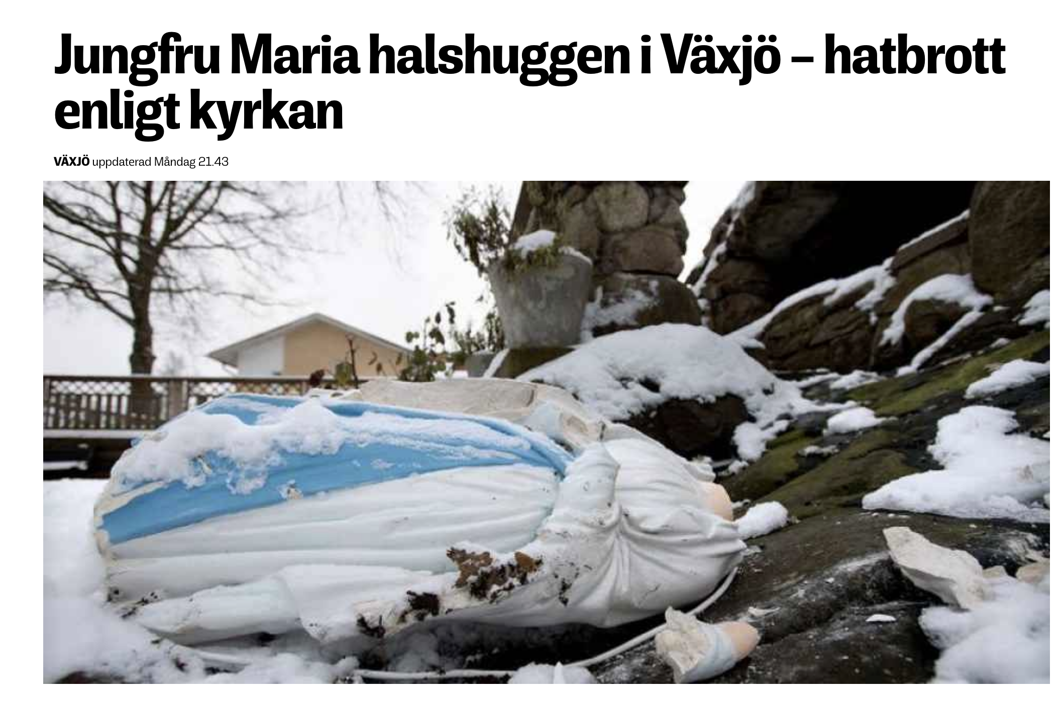 For noe over en uke siden oppdaget man at en statue av jomfru Maria ved St. Mikales katedral i Växsjö i Sverige var blitt utsatt for hærverk, melder svt.se. Statuen sto i en grotte, den såkalte Mariagrotten, utenfor kirken og skal veie over 100-200 kilo. Den var dratt ut av grotten, og både hode og hender var kappet av – og fjernet fra stedet.