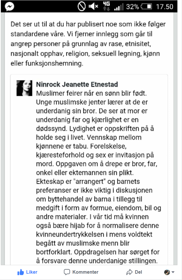 I går på torsdag kommer beskjeden igjen fra Facebook til Jeanette: Du er nå utestengt i tre døgn. Sensuren fra Facebook skyldes dette innlegget, som antakelig Facebook-brukere har masserapportert. Vi kan bare gjette hvem, ettersom Jeanette fremmer ramsalt kritikk mot islamsk kultur – som hun kjenner meget godt gjennom oppvekst i den både her i Norge og i Pakistan.