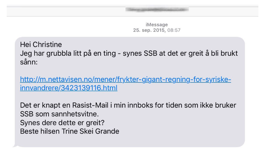 Vi registrerer at ingen av disse e-postene gjengis. Hvis Skei Grande tror at Holmøys rapport handler om muslimer, viser det bare at hun ikke har lest den. Likevel retter hun en slik meningsløs melding til daværende leder av SSB. Hva skulle i så fall SSB «rette opp»? Gå offentlig ut å fortelle at Skei Grande tror rapporten handler om muslimer, og slå fast at det tar SSB avstand fra?