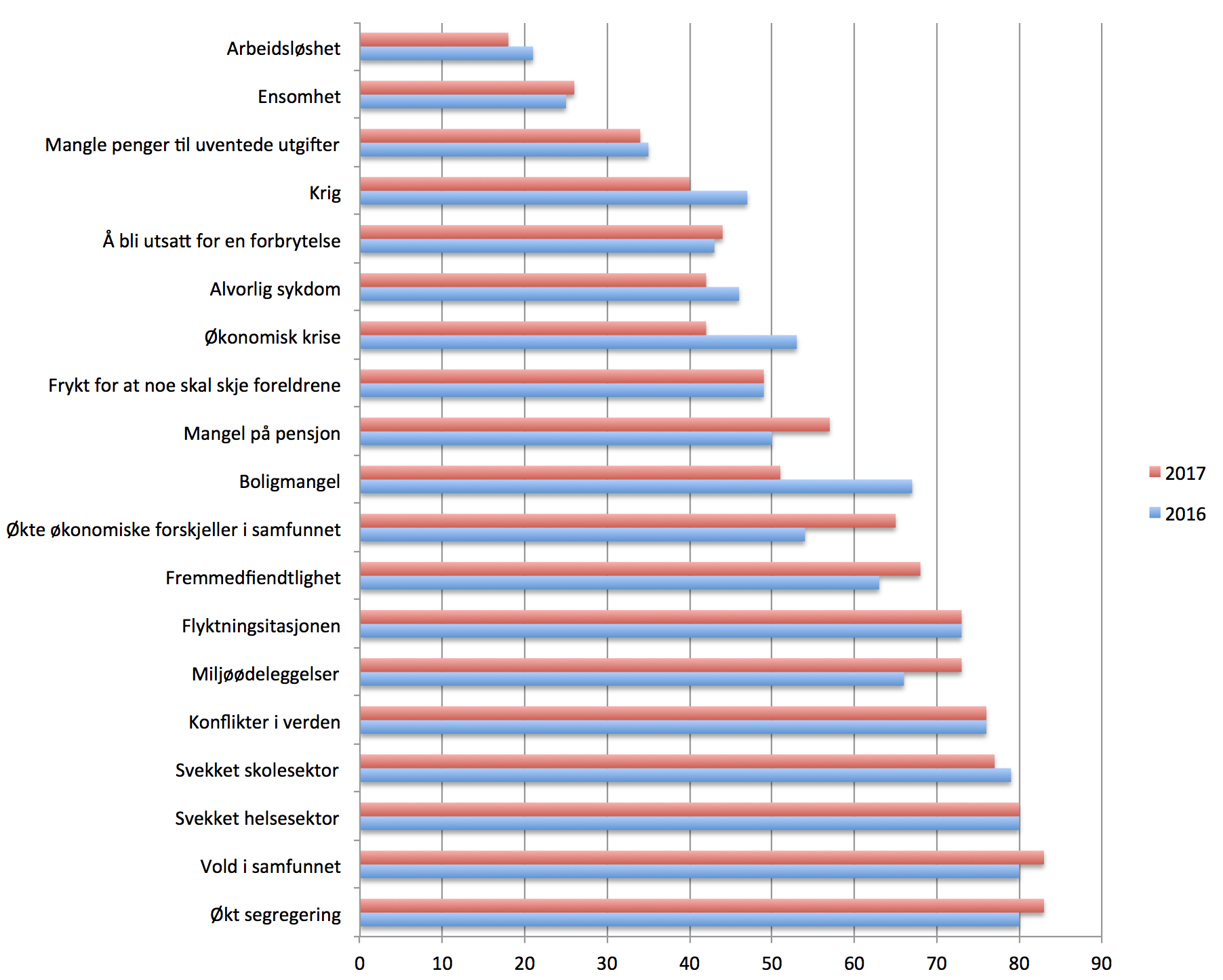 I 2017, som året før, er svenskene mest bekymret for økt segregering i samfunnet, vold, samt svekket helse- og skolesektor. Men mens stadig flere er blitt bekymret for segregering og vold, begge gikk fra 80 til 83 prosent, uttrykker noen færre bekymring for en svekket skole (fra 79 til 77 prosent). Bekymringen for svekket helsesektor ligger fast på 80 prosent.