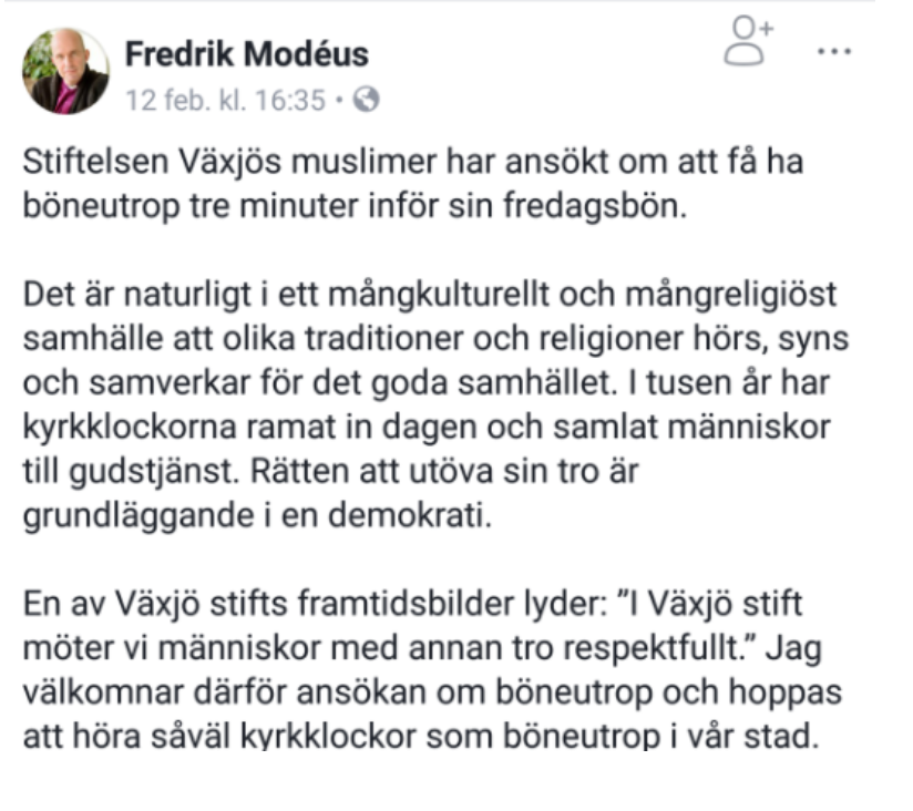 I Vårt Land (betalingsmur) kunne man således nylig lese at Kirken stiller seg bak bønnerop fra minareter. Foranledningen for at tema kom opp, var et fjernet Facebook-innlegg fra den svenske biskopen Fredrik Modéus som støttet at en moské i Väksjö kan få kalle inn til bønn.