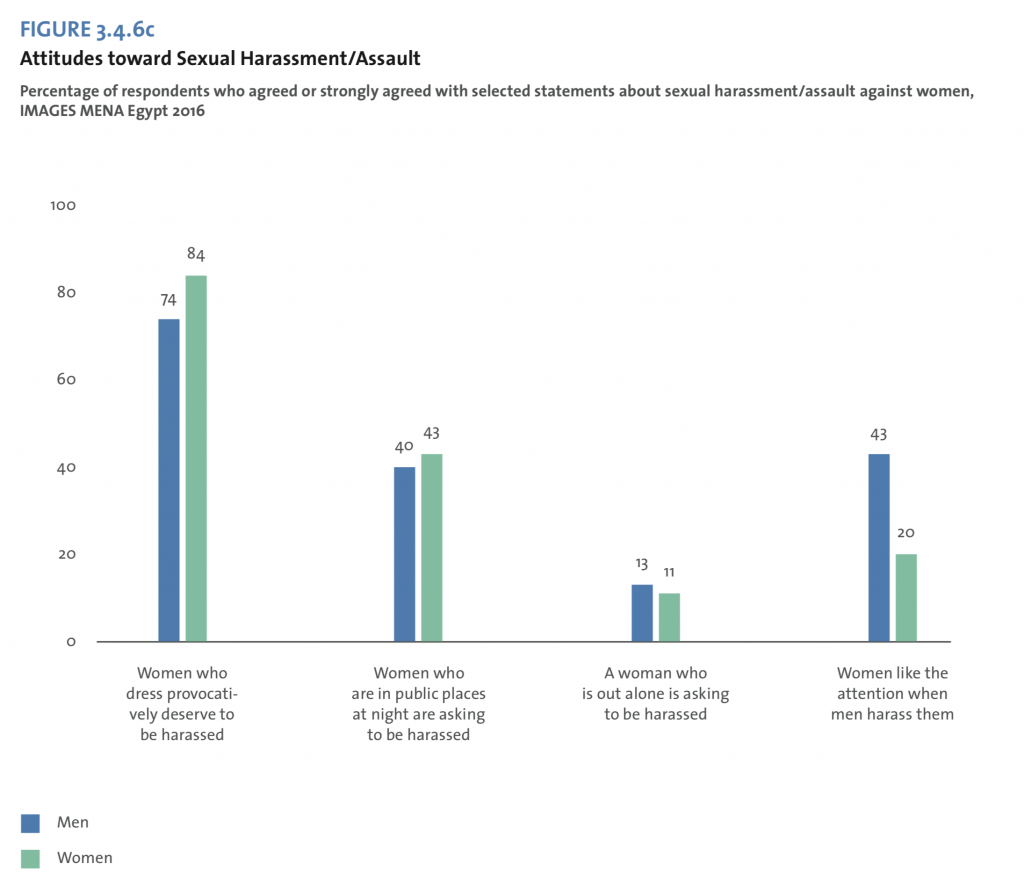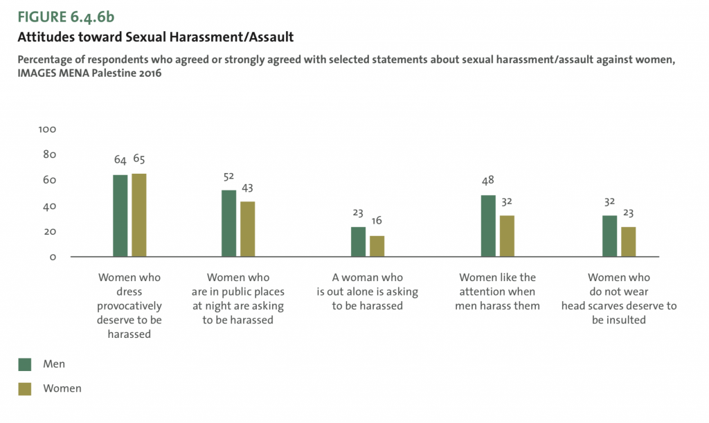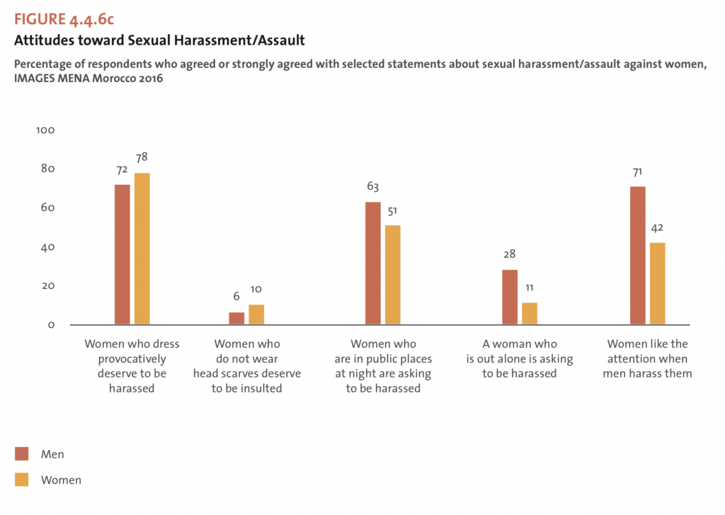 En tredjedel av mennene oppgir å ha seksuelt trakassert kvinner, mens 60 prosent av kvinnene oppgir å ha blitt seksuelt trakassert. 68 prosent av mennene og 32 prosent av kvinnene mener at kvinnelige slektningers adferd og klær har effekt på menns ære. Imidlertid foreligger ikke spørsmålet om hvordan de ser på ofre for trakassering, så det er ikke mulig å lese direkte ut av rapporten. Holdningene som ellers fremkommer avviker i liten grad fra de to foregående landene, så en viss pekepinn finnes dog.