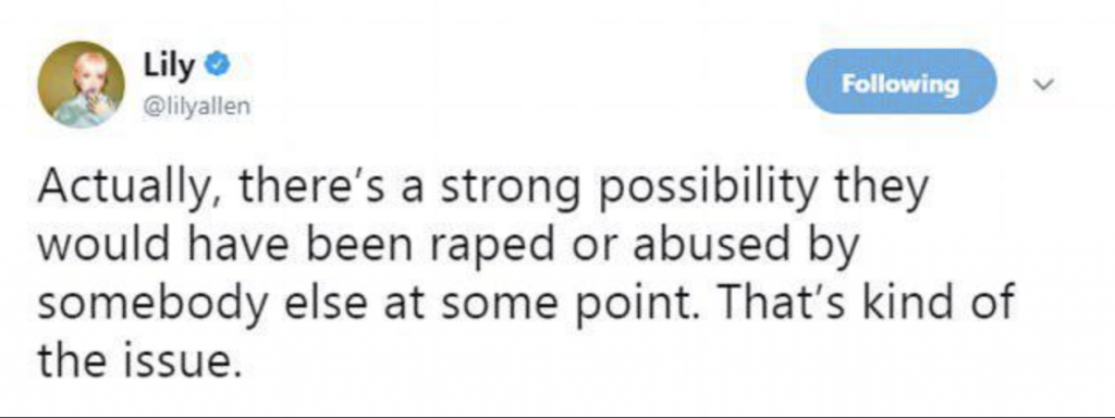 Et slående eksempel på denne typen selektiv empati og kvinneaktivisme, er popsangeren Lily Allen. Hun har vært svært så aktiv i mediene i forbindelse med Metoo og har blant annet anklaget en britisk komiker for seksuell trakassering. Og empati har hun visstnok i bøttevis, i alle fall nok til å gråtende – mens man ble fotografert, naturligvis – be afghanske asylsøkere i den ulovlige migrant-leieren i Calais om unnskyldning på vegne av hele Storbritannia. Dette er hva den empatiske kvinneforkjempende Allen hadde å si om voldtektene i Rochdale: