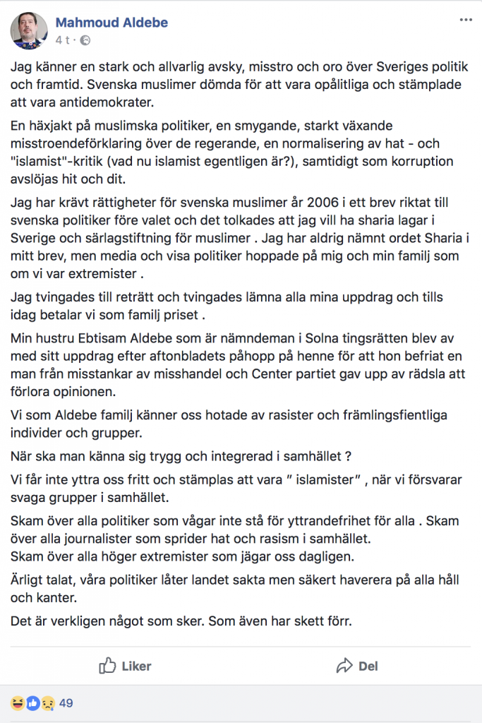 Svenske muslimer blir nemlig dømt for å være upålitelige og blir stemplet som antidemokrater, klager han. Nei, svenske muslimer gjør ikke det, men Ebtisam Aldebe, Hasan Fransson og før det Mahmoud Aldebe selv, gjør det. Med god grunn.
