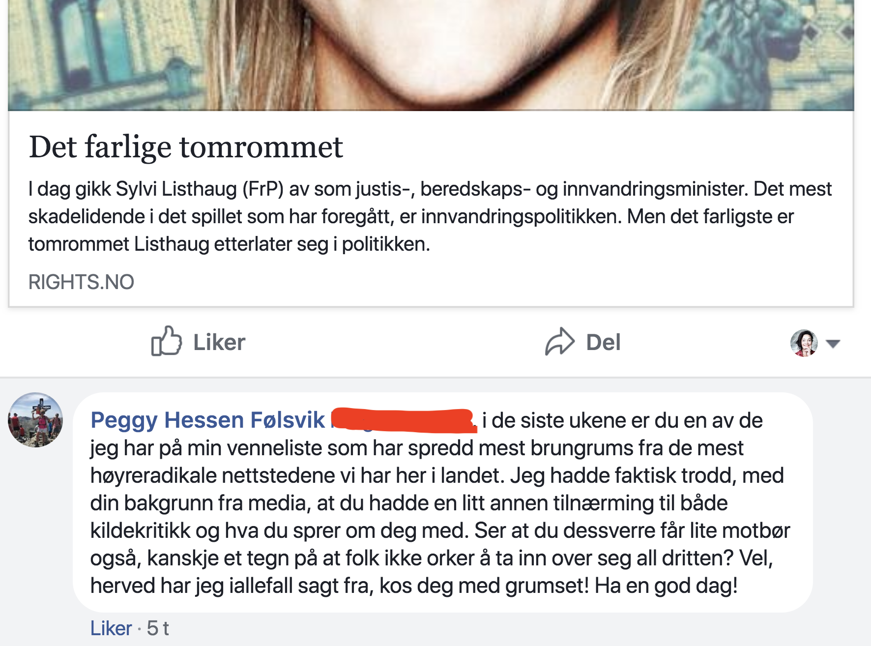 En som delte denne saken på Facebook fikk imidlertid raskt svar fra ei som selv mener å befinne seg innenfor anstendighetens grenser. Vedkommende som delte saken har 40 års erfaring som journalist i diverse aviser, og har også vært tillitsvalgt i Norsk Journalistlag. Men den «anstendige» fagforeningslederen Peggy Hessen Følsvik, som er 1. nestleder i LO, hadde følgende melding til oss som ønsker en anstendig debatt:
