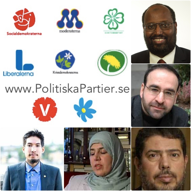 Moderaterna har hatt en riksdagspolitiker som mener at menn har rett til å slå sine koner. Koner i flertall, for Abdirizak Waberi (bildet, øverst til høyre) støtter muslimske menns angivelig guddommelige rett til å ta seg fire koner. Miljöpartet har hatt en boligminister – Mehmet Kaplan (bildet, nest øverst til høyre) – som deltok på møter med den islamistiske og sterkt antisemittiske organisasjonen Milli Görus, og måtte gå av i 2016. I tillegg hadde de kandidaten Yasri Khan (bildet, nederst til venstre), som i likhet med Kaplan kom fra den heller tvilsomme organisasjonen Svenska Muslimer för Fred och Rättvisa, som måtte forlate partiet da det ble kjent at han nektet å håndhilse på kvinner. Flere i partiledelsen visste dette fra før, men reagerte altså ikke før det ble oppstyr i pressen. Socialdemokraterna har hatt en styreleder, Adrian Kaba, som legitimerte jødehat og antisemittiske konspirasjonsteorier og måtte gå av som ordfører for en dialoggruppe som «skulle øke forståelsen mellom ulike religiøse grupper i Malmö».