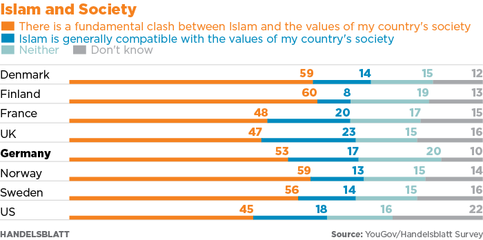 I juni 2017 foretok det anerkjente analyseinstituttet YouGov en måling i åtte forskjellige land, blant dem Norge, om innvandring og islam. Målingen viste at 59 prosent mener at det foreligger en fundamental konflikt mellom islam og det øvrige samfunnet. Små 13 prosent mener at islam generelt er kompatibel med det norske samfunnets verdier.