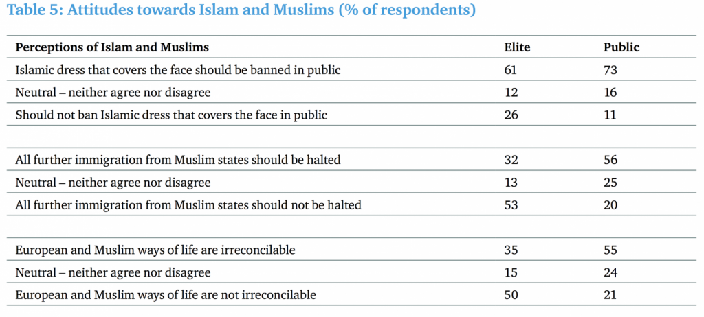 I februar 2017 publiserte The Royal Institute of International Affairs, avdeling Chatham House, en omfattende undersøkelse som viste at eliten er skeptisk til islam; en betydelig del av selv denne privilegerte gruppen mener faktisk at all videre innvandring fra muslimske land bør stanses, og at europeisk og islamsk livsstil er uforenelige størrelser (hhv. 32 og 35 prosent mot befolkningens 56 og 55 prosent). En stor majoritet – 61 av prosent av eliten og 73 prosent av befolkningen – støtter forbud mot bruk av ansiktsdekkende, islamske plagg i det offentlige rom.