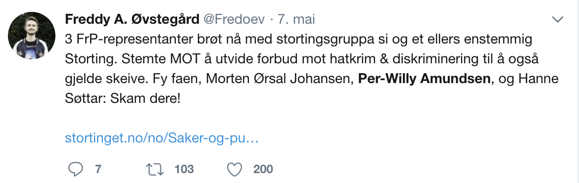 Når altså (bare) tre stemte mot, og dertil til det som må defineres som en «etisk problemstilling», kan det kanskje handle om at vi snakker tre som opposisjoner mot eget parti, at representantene er «sluppet løs» eller at saken ikke har vært oppe i gruppa i det hele tatt. Men på «pølen av hat & forakt», altså twitter, mener noen å vite hva som har foregått og vi får også vite hvem de tre er (samtlige fra Fremskrittspartiet):