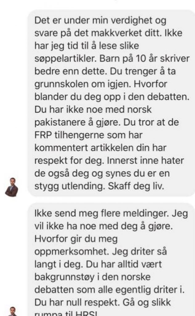 «Det er under min verdighet og svare på det makkverket ditt. Ikke har jeg tid til å lese slike søppelartikler. Barn på 10 år skriver bedre enn dette. Du trenger å ta grunnskolen om igjen. Hvorfor blander du deg opp i den debatten. Du har ikke noe med norsk pakistanere å gjøre. Du tror at de FRP tilhengerne som har kommentert artikkelen din har respekt for deg. Innerst inne hater de også deg og synes du er en stygg utlending. Skaff deg et liv.