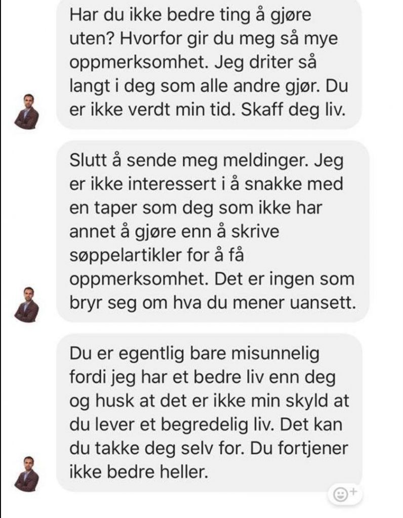 Ikke send meg flere meldinger. Jeg vil ikke ha noe med deg å gjøre. Hvorfor gir du meg oppmerksomhet. Jeg driter så langt i deg. Du har alltid vært bakgrunnstøy i den norske debatten som alle egentlig driter i. Du har null respekt. Gå og slikk rumpa til HRS!»