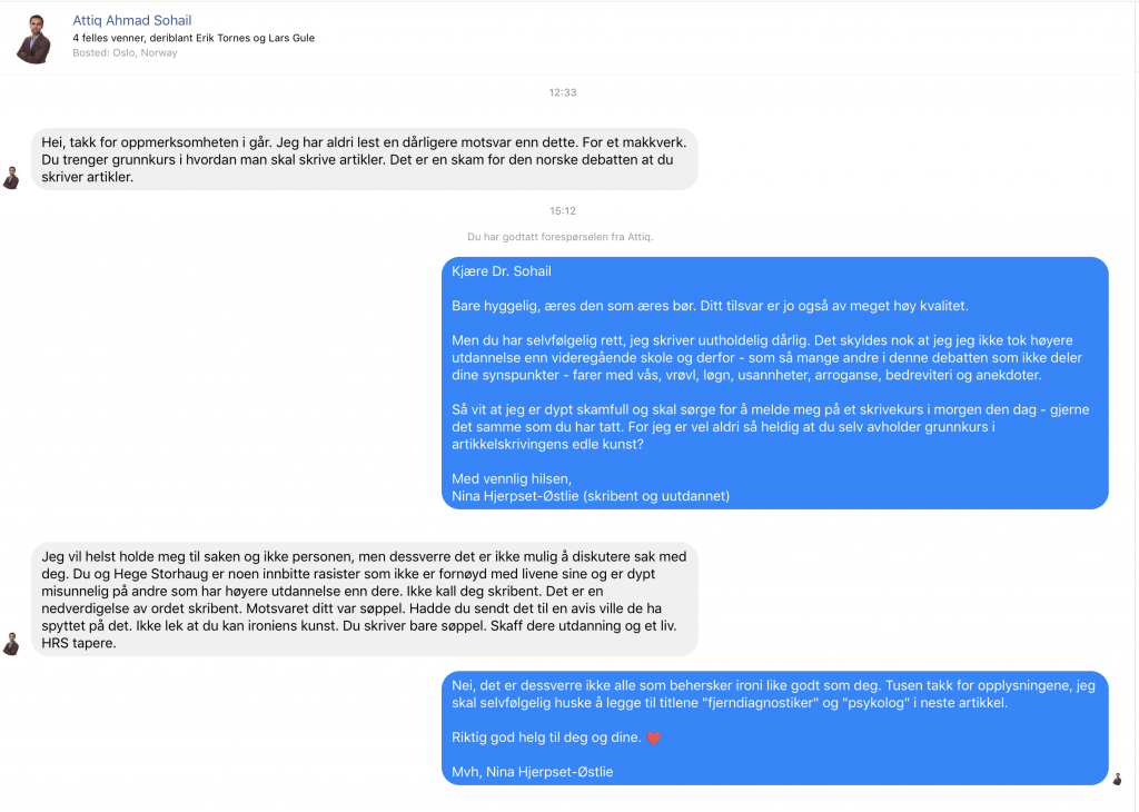 «Hei, takk for oppmerksomheten i går. Jeg har aldri lest en dårligere motsvar enn dette. For et makkverk. Du trenger grunnkurs i hvordan man skal skrive artikler. Det er en skam for den norske debatten at du skriver artikler.»