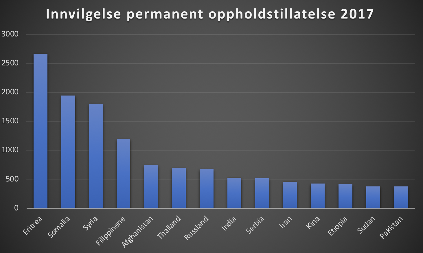 Ser vi på hvem som fikk innvilget permanent oppholdstillatelse i 2017, og som altså kan søke om norsk statsborgerskap, så går mange av de samme landene igjen. Totalt ble det innvilget 17.086 permanente oppholdstillatelser i 2017 der Eritrea er på topp med 2.664, etterfulgt av Somalia (1.944) og tett på følger Syria (1.806), jamfør figur som viser de 14 landene med flest oppholdstillatelser (kilde: UDI).